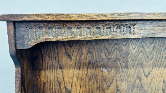 A LARGE CARVED REPRODUCTION OAK WELSH DRESSER WITH DIVIDED UPPER TIER AND RING PULL HANDLES, W 187CM X H 167CM.