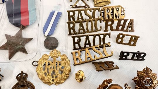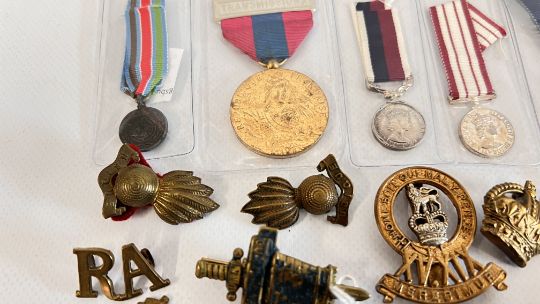 A TRAY OF WW1 & WW2 MILITARY BADGES AND MEDALS.