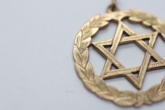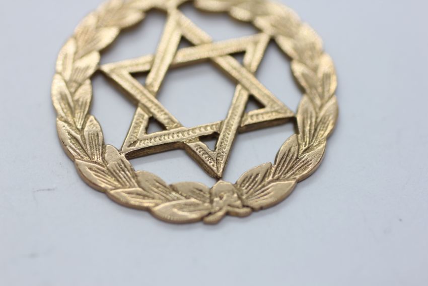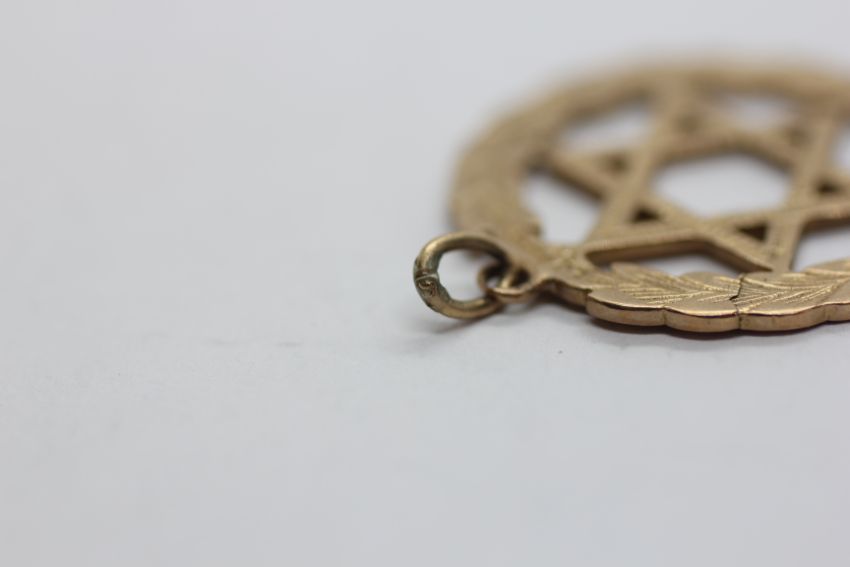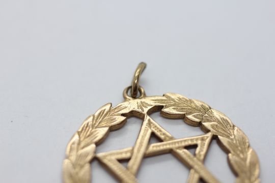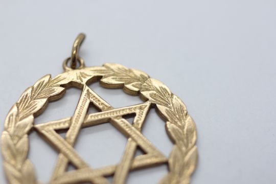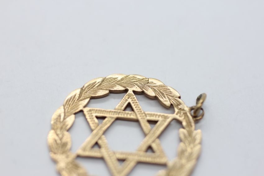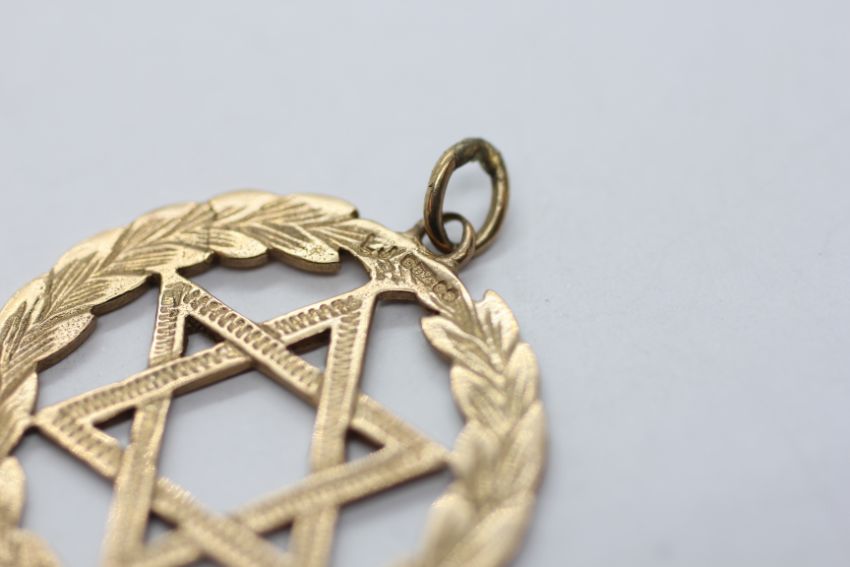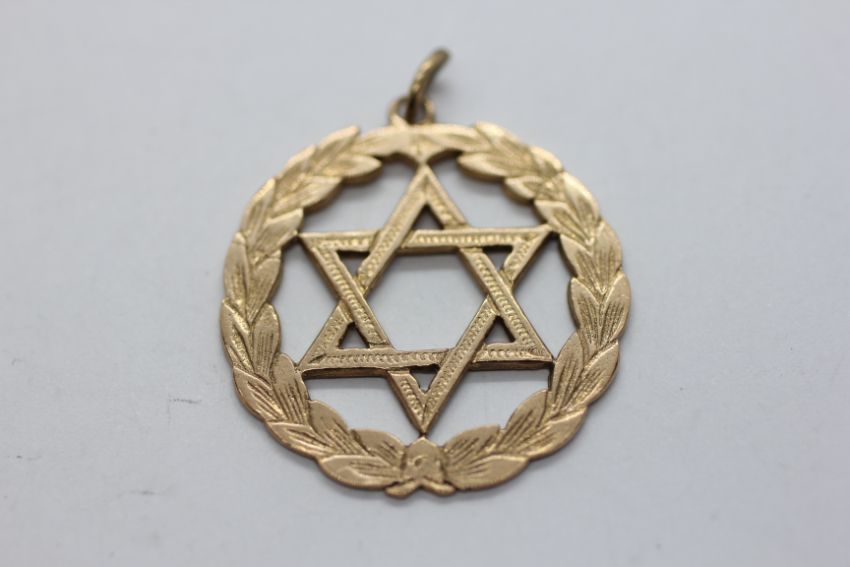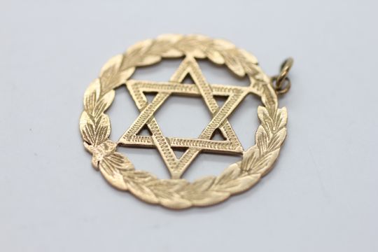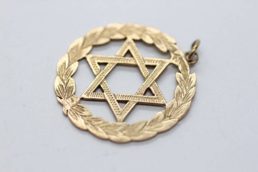 A 9CT GOLD STAR OF DAVID PENDANT, DIAMETER 3CM.