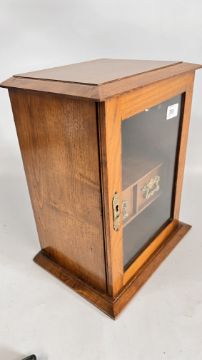 AN ANTIQUE OAK SMOKER'S CABINET (NO KEY OR MECHANISM) W 29.5 X D 21.5CM X H 36CM ALONG WITH TWO VINTAGE MEERSCHAUM PIPES IN FITTED CASES, ONE EXAMPLE APPEARS IN UNUSED CONDITION WITH AMBER DETAIL.