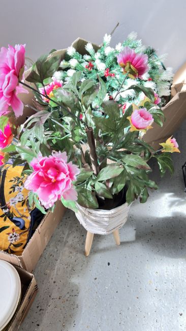 17 X BOXES CONTAINING AN EXTENSIVE GROUP OF HOUSEHOLD SUNDRIES - CHINA AND GLASS, STAINLESS STEEL KITCHENALIA, LAMPS, CUSHIONS AND CLEANING PRODUCTS, FOOT SPA, HOOVER BATTERY VACUUM CLEANER, BOSCH IRON AND AN XMAS TREE AND STAND ETC. - SOLD AS SEEN.
