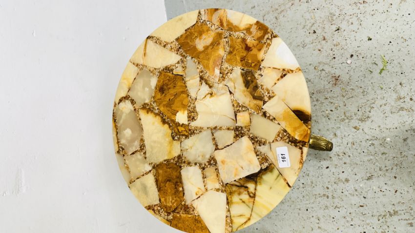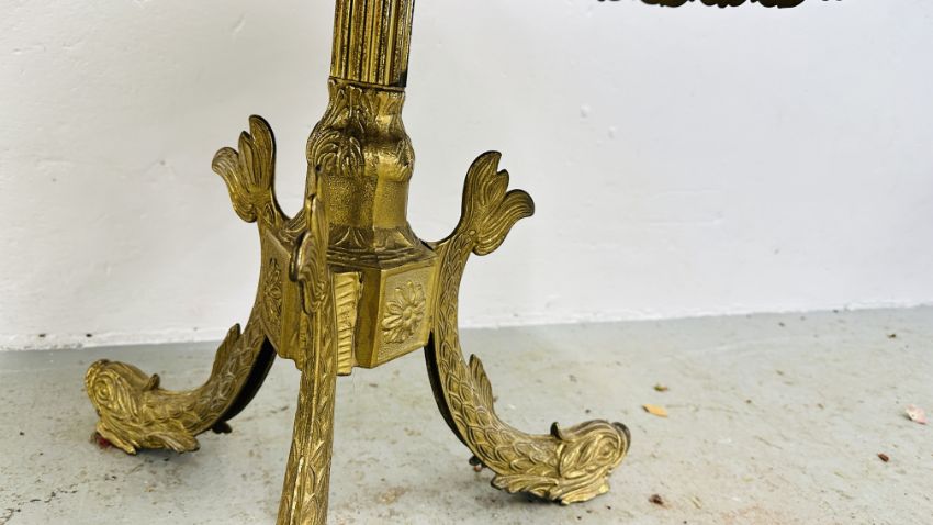 REPRODUCTION GILT FINISHED NEO CLASSICAL PILLAR SUPPORT ALONG WITH A BRASS FRAMED COFFEE TABLE WITH FISH DETAIL.
