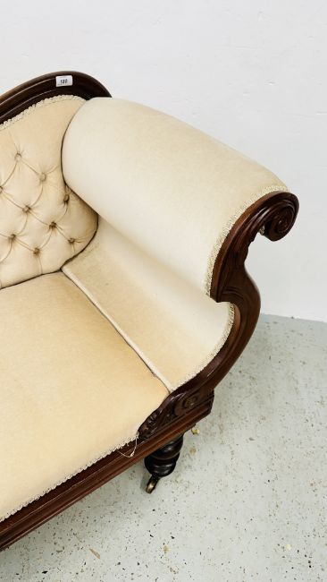 MAHOGANY FRAMED PEACH UPHOLSTERED CHAISE LOUNGE.