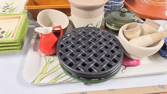 5 X BOXES CONTAINING A GROUP OF ASSORTED KITCHENALIA TO INCLUDE STUDIO POTTERY SERVING BOWLS, STAINLESS STEEL FISH KETTLE, JUICER AND TWO TAGINES ETC. + A LAZY SUSAN (NOT COMPLETE).