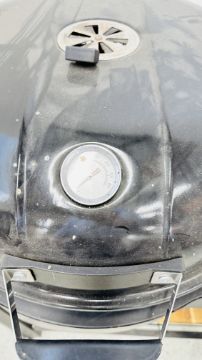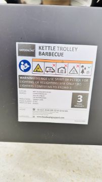 A KETTLE TROLLEY CHARCOAL BARBECUE ALONG WITH VARIOUS BARBECUE ACCESSORIES.