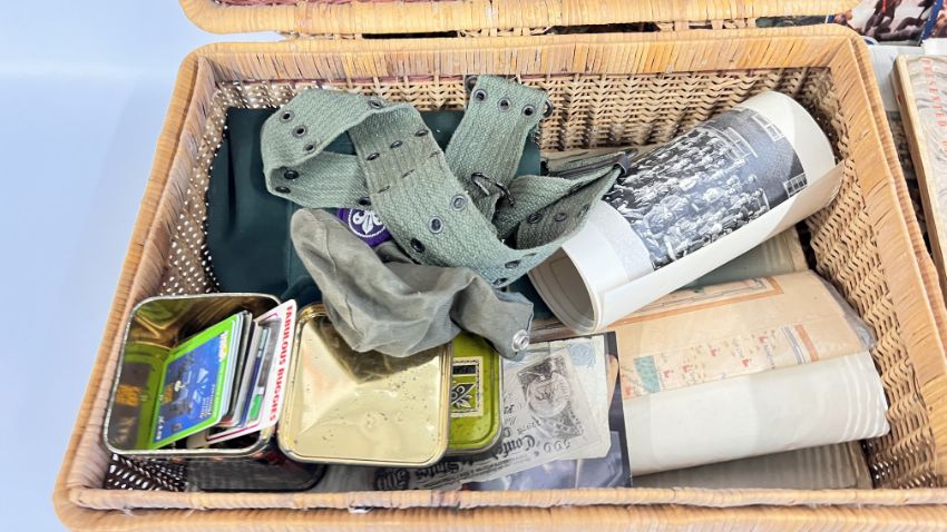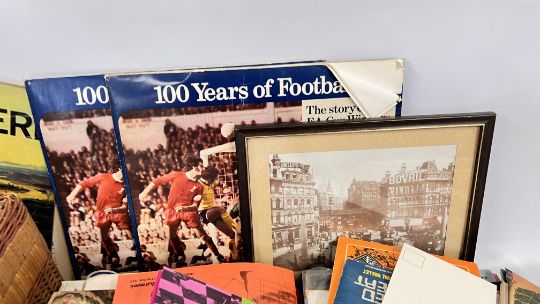 A BOX AND A PICNIC BASKET CONTAINING A QUANTITY OF ASSORTED EPHEMERA TO INCLUDE FOOTBALL RELATED EXAMPLES, BANK NOTES, COINAGE, TOKEN, CIGARETTE CARDS AND ASSORTED BADGES ETC.