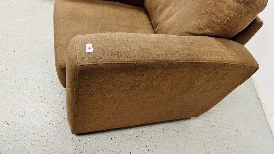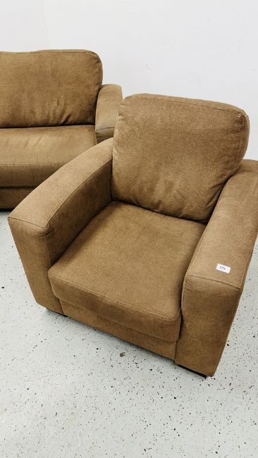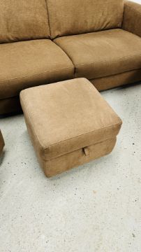 A MODERN FAWN UPHOLSTERED TWO SEATER SOFA, PAIR OF MATCHING ARMCHAIRS AND FOOTSTOOL.