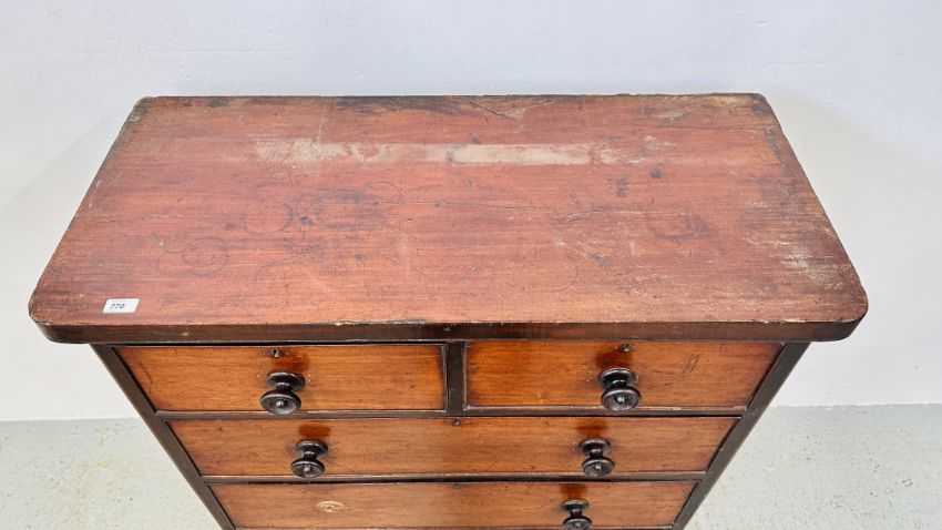 A VICTORIAN FIVE DRAWER CHEST, THE TWO SHORT DRAWERS OVER THREE LONG (POOR CONDITION), W 102.5CM.