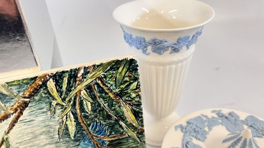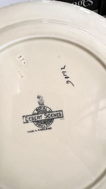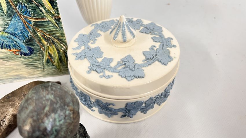 A GROUP OF SUNDRY CHINA TO INCLUDE 2 X ROYAL DOULTON IMAGES FIGURINES PEACE HN2470 AND THANKFUL HN3129, SYLVAC MONKEY STUDY, FRITH SCULPTURE "HARE" STUDY, LIBRA BIRD, ROYAL DOULTON DESERT SCENES PLATE + WEDGWOOD EMBOSSED QUEENS WARE ETRURIA & BARLASTON VASE & TRINKET POT AND COVER ETC.