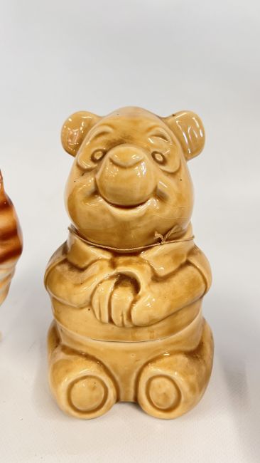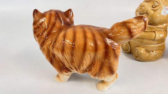 TWO GLAZED CERAMIC CAT STUDIES, ONE BEARING A MONOGRAM + A WALT DISNEY 1987 WINNIE THE POOH STORAGE JAR.