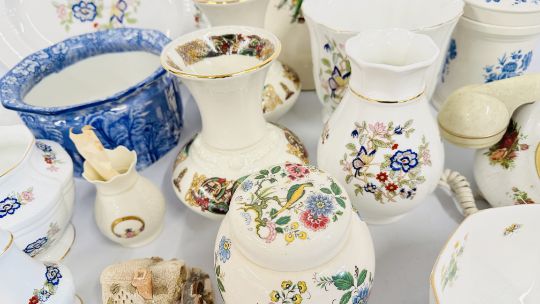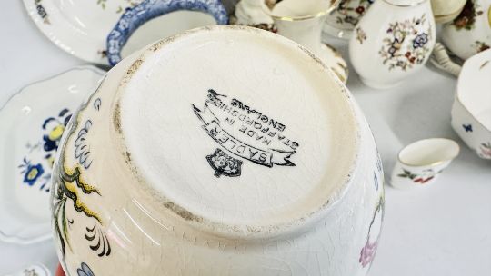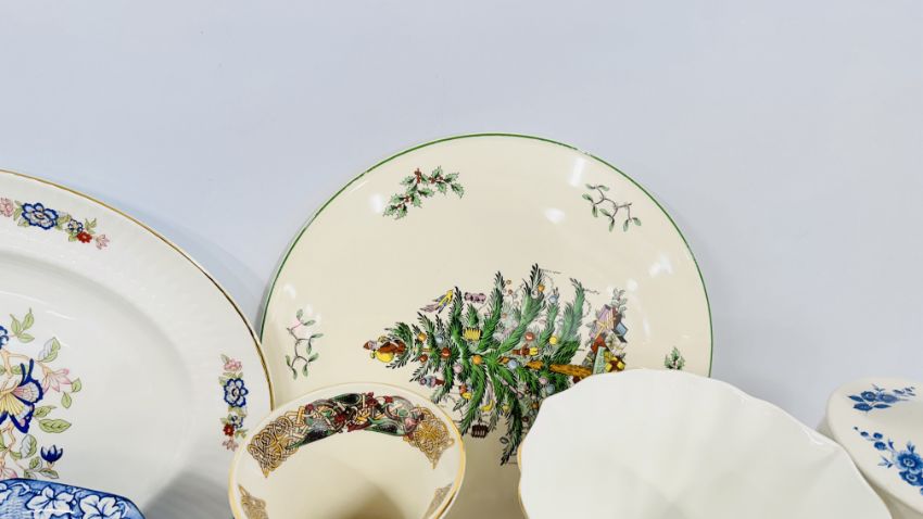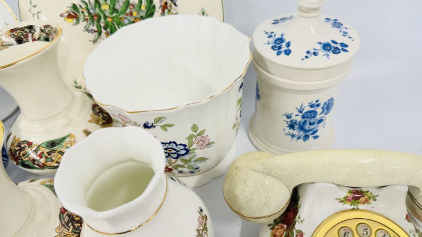 A GROUP OF ASSORTED SUNDRY CHINA TO INCLUDE ROYAL WORCESTER, SPODE BLUE BIRD MEAT PLATE, LILIPUT LANE COTTAGE, THE NATIONAL TRUST, SADLER GINGER JAR, SPODE CHRISTMAS TREE CAKE PLATE, ROYAL ALBERT OLD COUNTRY ROSES TELEPHONE, SMALL DRESDEN DISH A/F AND ROYAL TARA EXAMPLES + A PAIR OF "CRE" IRISH PORCELAIN VASES, BEARING GILT SIGNATURE.
