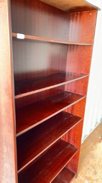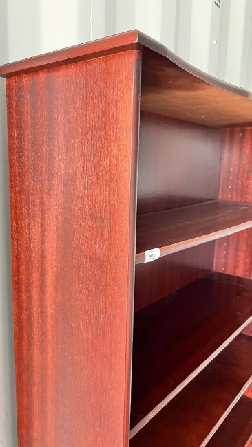 A MODERN MAHOGANY EFFECT FINISH FULL HEIGHT SIX TIER OPEN BOOKSHELF.