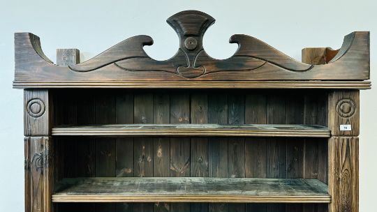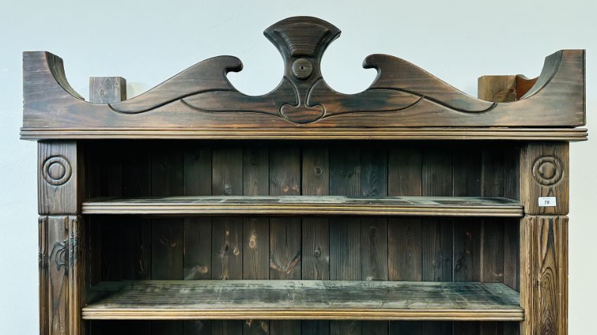 A BESPOKE FLOOR STANDING STAINED PINE OPEN BOOKSHELF, W 95CM X H 104CM.