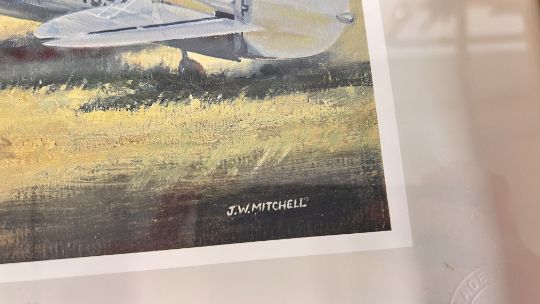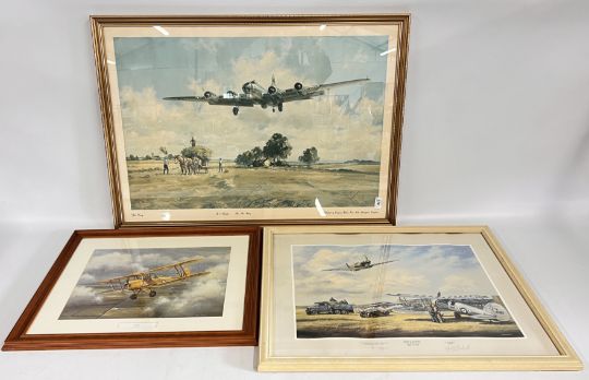 A GROUP OF THREE FRAMED AIRCRAFT RELATED PRINTS TO INCLUDE TIGER MOTH BY ROY GARNER, B.17 BOMBER SHOO SHOO BABY + A DEBUT AT DUXFORD LIMITED EDITION 167/450 BEARING ARTIST PENCIL SIGNATURE J.W. MITCHELL AND PENCIL AIR COMMODORE H.I. COZENS.