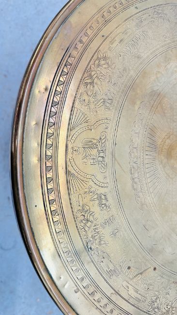 A VINTAGE PERSIAN ENGRAVED CIRCULAR BRASS TABLE TOP SUPPORTED ON A FOLDING WOODEN BASE - DIAM 52CM.