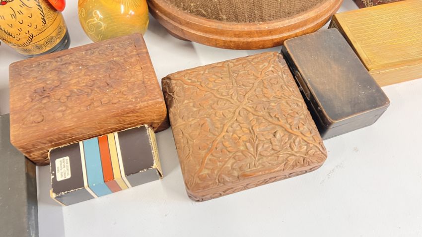 A BOX OF COLLECTIBLES TO INCLUDE VARIOUS BOXES CARVED AND SKIN EXAMPLES, TWO BRASS STATE EXPRESS CIGARETTE BOXES, EMBROIDERED POUCH CONTAINING A PRAYER BOOK, CIRCULAR NEEDLE WORK LOW STOOL, RUSSIAN STYLE NESTING DOLLS ETC.