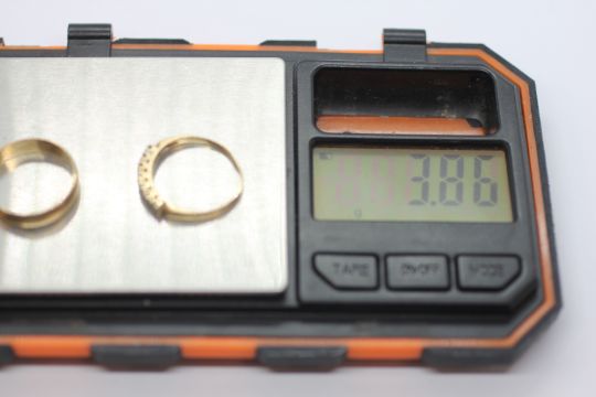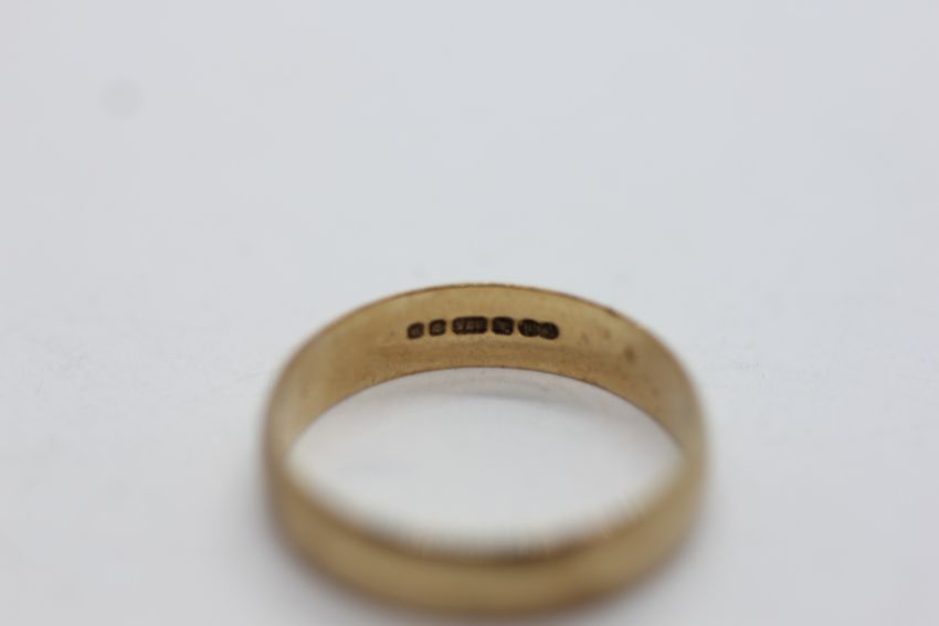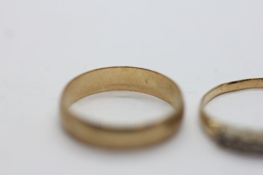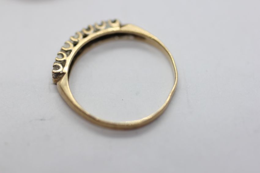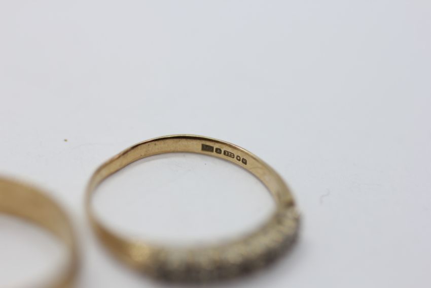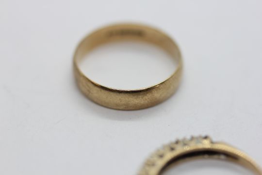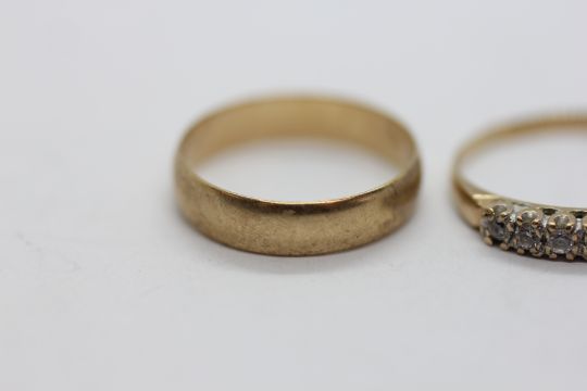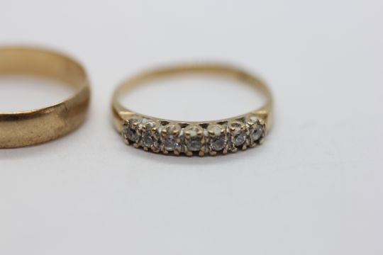 A 9CT YELLOW GOLD WEDDING BAND SIZE Q/R AND A 9CT GOLD SEVEN STONE CZ LADIES RING SIZE Q/R.