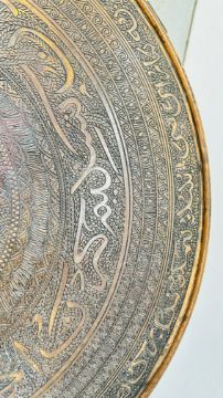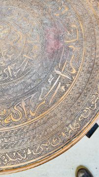 A MIDDLE EASTERN PERSIAN STYLE COPPER ENGRAVED MULTI PURPOSE TRAY / GAMES TABLE ON A FOLDING WOODEN BASE, DIAMETER 59.5CM.