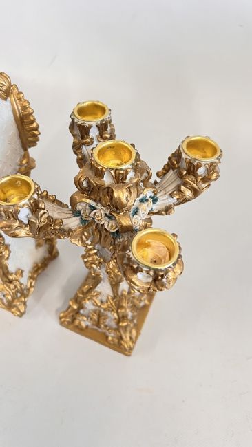 A MODERN DECORATIVE RESIN CLOCK GARNITURE MARKED "WELLINGTON" + A REPRODUCTION ART NOUVEAU RESIN FIGURED SCULPTURE MARKED "VERONESE".