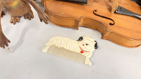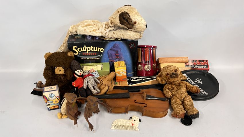 A BOX OF ASSORTED VINTAGE GAMES TO INCLUDE "THE MAGNUM" CRICKET BAT, VIEW MASTER, DOMINO AND CHESS PIECES, VINTAGE AVON SOAPS IN ORIGINAL BOXES + A VINTAGE TIN DEPICTING MEDALS + A BOX OF VINTAGE TEDDY BEARS ETC. & VIOLIN.