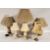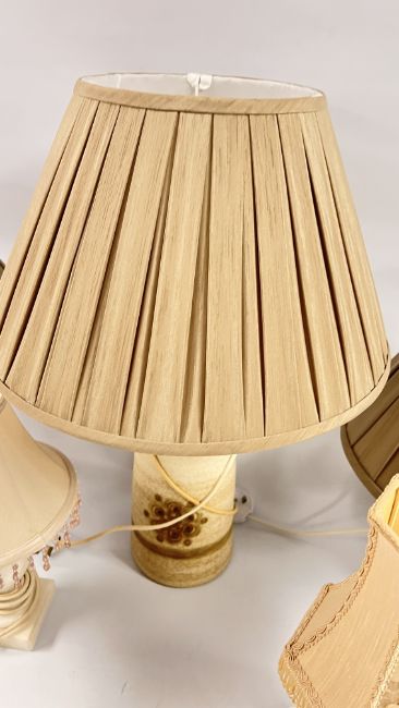 A GROUP OF TABLE LAMPS AND SHADES TO INCLUDE A PAIR OF POLISHED HARD STONE EXAMPLE, JERSEY POTTERY ETC.