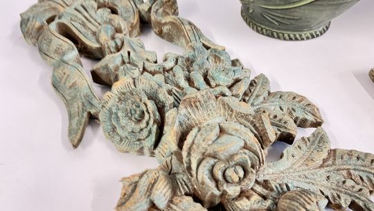 A RESIN PLAQUE DEPICTING CHERUBS, CARVED FLORAL WALL SCULPTURE + A LARGE MODERN ART VASE AND SIMILAR EWER.