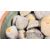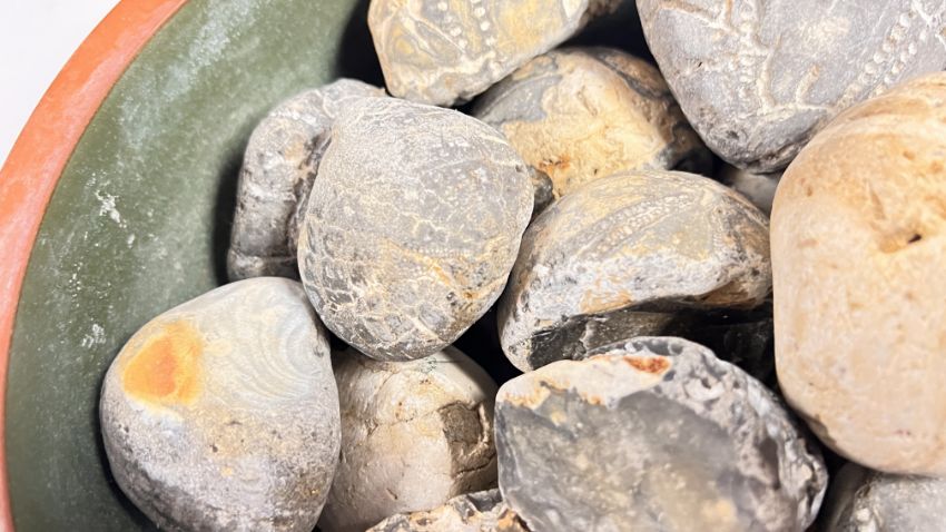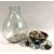 A LARGE GLASS CARBOY (RIM CHIP) + A BOWL OF ASSORTED URCHIN FOSSILS & 3 ART GLASS PAPERWEIGHTS.