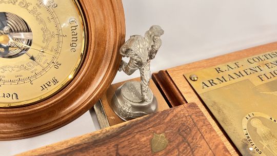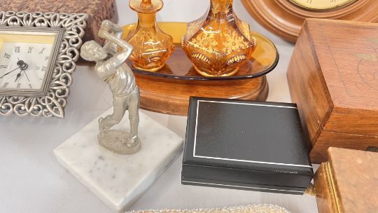 A BOX OF COLLECTIBLES TO INCLUDE CARVED AND INLAID BOXES, FIRST DAY COVERS, VINTAGE CLINICAL THERMOMETER IN ORIGINAL BOX (COLLECTOR'S ITEM ONLY), ZIPPO LIGHTER, RAF COLTISHALL / NEATISHEAD COMMEMORATIVE AWARD DEPICTING A PILOT SCULPTURE, AND AN RAF COLTISHALL ARMAMENT ENGINEERING FLIGHT PLAQUE + AN ART DECO BOHEMIAN AMBER GLASS 3 PIECE DRESSING TABLE SET ETC.