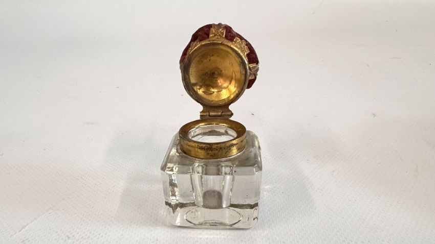 AN ANTIQUE GILT DECORATED CORONATION INKWELL.
