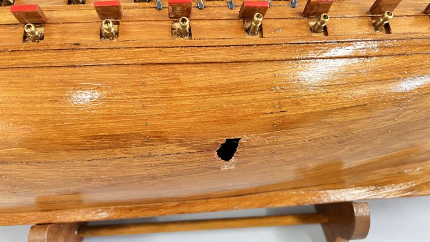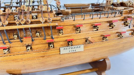 A LARGE WOODEN MODEL OF A BATTLE SHIP, REQUIRES ATTENTION + A SMALLER YACHT EXAMPLE.