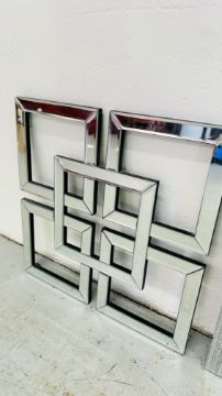 A MODERN FIVE SQUARE INTERLOCKING WALL MIRROR, A RECTANGULAR WALL MIRROR AND ONE OTHER.