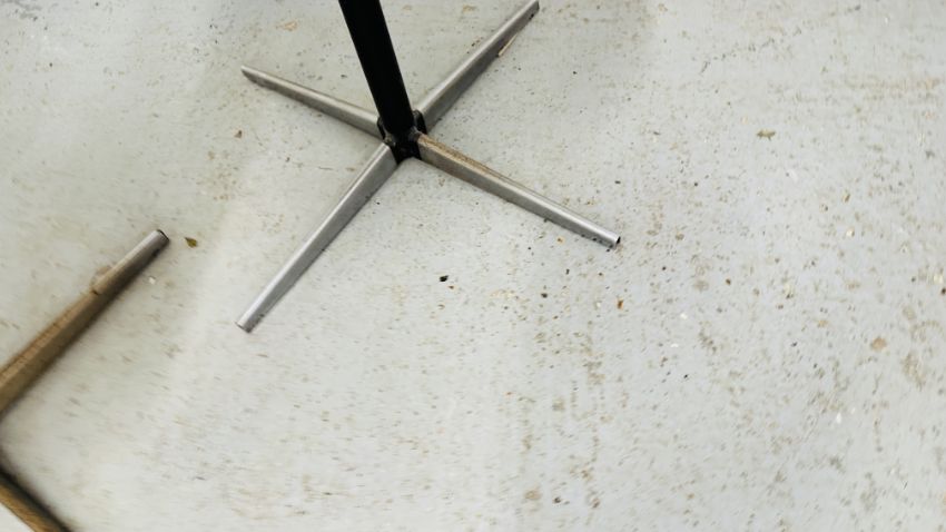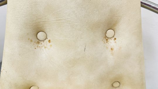 A PAIR OF MID CENTURY ATOMIC STYLE CREAM VINYL SWIVEL CHAIRS ON A CHROME METAL BASE.
